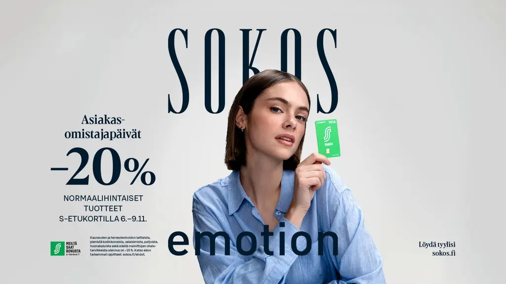 Sokos Asiakasomistajapäivät Sokoksella 6.–9.11. Lähes koko valikoima –20 % S-Etukortilla Sokoksella, Sokos Emotionissa ja verkkokaupassa sokos.fi Tee löytöjä ja hanki parhaat joululahjat edullisesti! Ostoksille