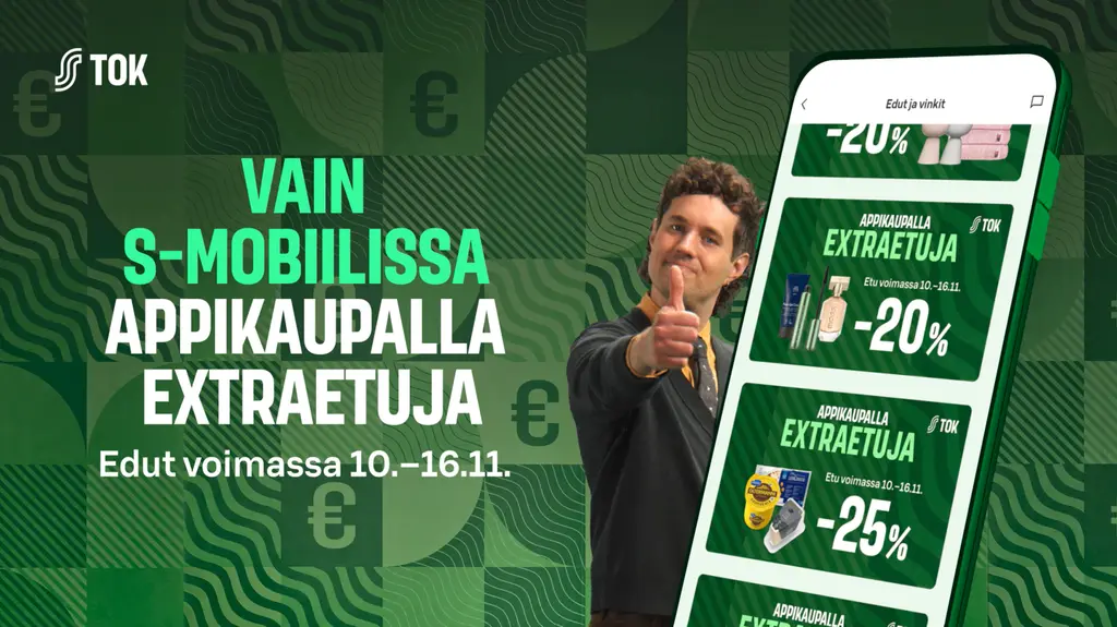 10.-16.11. S-mobiilista löytyy extraetuina etukuponkeja, jotka ovat voimassa vain viikon ajan Turun Osuuskaupan toimipaikoissa. Katso kaikki etukupongit S-mobiilista ja hyödynnä edut!