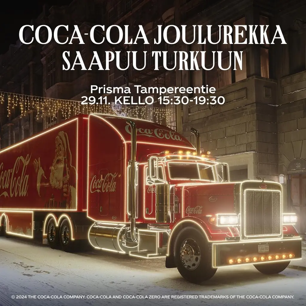 Tuhansilla valoilla koristeltu Coca-Cola Joulurekka vierailee marras-joulukuussa 11 paikkakunnalla ympäri Suomea. Kiertue järjestetään kuudennen kerran Suomessa ja aiemmilla kiertueilla kuhunkin tapahtumaan on osallistunut tuhansia kävijöitä. Coca-Cola Joulurekka on reilun 20 vuoden aikana vieraillut kansainvälisesti yli 300 kaupungissa ympäri maailmaa.Joulurekka saapuu kiertueellaan Prisma Tampereentielle perjantaina 29.11.2024 klo 15.30 – 19.30. Tampereentien Prisma on ainoa S-ryhmän toimipaikka, jossa rekka kiertueella pysähtyy.Joulurekka tuo jokaiselle kiertuepaikkakunnalle joulutapahtuman, jossa pääsee katsomaan rekkaa läheltä ja otattamaan valokuvan itsestään rekan kanssa sen parhaimmassa kuvauskohdassa. Tapahtumassa jaetaan ilmaisia juomia ja tyhjän tölkin voi palauttaa alueella olevaan kierrätysrulettiin, josta voi voittaa jouluisia palkintoja. Tapahtuma-alueelle on tänä vuonna rakennettu myös kokonaan uusi oleskelualue ja sekä pari uutta kiinnostavaa valokuvauspistettä. Lisäksi kiertueohjelmaan kuuluu hauska ja ennen näkemätön yllätysaktiviteetti, johon liittyy joulukuusi.Joulu on hyvien tekojen aikaa ja jokainen voi jakaa hyvää joulumieltä myös Joulurekkatapahtumassa. Vierailijoilla on mahdollisuus palauttaa tyhjä juomatölkkinsä kierrätysrulettiin, jolla pyritään keräämään kaikki jaetut tölkit takaisin ja varmistaa tapahtuma-alueen siisteys. Kaikkien palautettujen tölkkien pantit lahjoitetaan aiempien vuosien tapaan hyväntekeväisyyteen. Tänä vuonna pantit ohjataan Suomen Punaisen Ristin Hyvä joulumieli -keräykseen, jolla kerätään varoja vähävaraisten lapsiperheiden ruokalahjakortteihin, jotta perheet voivat ostaa ruokaa joulupöytään.Coca-Colan Joulurekkatapahtumaan ovat kaikenikäiset vieraat tervetulleita. Coca-Cola on sitoutunut olemaan markkinoimatta juomiaan alle 13-vuotiaille lapsille. Tämän vuoksi alle 13-vuotiaat ovat tervetulleita nauttimaan Joulurekan tunnelmasta ja juomista tapahtuma-alueelle vain huoltajiensa seurassa. Tapahtumassa ei ole vain lapsille suunnattua ohjelmaa ja juoma annetaan lapsille vain vanhempien pyynnöstä.Edellisvuosien tavoin on todennäköistä, että kunkin tapahtuman kävijämäärät ovat suuria. Kävijöiden onkin hyvä varautua liikenneruuhkiin tapahtuma-alueen läheisyydessä. Paikalle saapuvien kannattaa suosia julkista liikennettä ja jättää henkilöauto kauemmas.