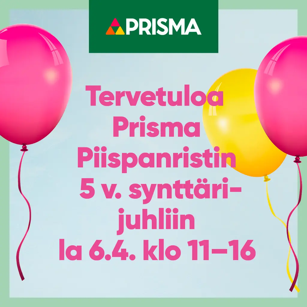Prisma Piispanristi viettää 5-vuotissynttäreitään lauantaina 6.4. klo 11-16. Myymälä on täynnä juhlahumua ja tuotetarjouksia. Ostosreissun lomassa pääset nauttimaan tuotteiden ja palveluiden esittelyistä, sekä tietenkin huipputarjouksista! Myymälässä on synttäreiden kunniaksi sima ja munkkitarjoilu.Osallistu kaupalla 300 € arvoisen S-ryhmän lahjakortin arvontaan. Tule moikkaamaan Onni Oravaa ja Prisma Kengurua. Lisäksi myymälässä on myös muuta mukavaa ohjelmaa perheen pienimmille mm. kasvomaalausta/glitter, paloauto hälytysvaroituksella.Synttäriviikolla kannattaa myös kokeilla S-kaupat -ruokatilausta. S-kaupat nouto 0 € klo 17-21 ti-la 2.-6.4.Prisma Piispanristillä bonusneuvoja paikalla lauantaina 6.4. klo 11–16. 100 euron lahjakortin lisäksi mobiililiittyjille heti mukaan 5 pakettia Juhla Mokkaa!Uutena palveluna Piispanristillä on aloittanut Prisma.fi -myymälänouto. Toimitus noutopisteelle vain 12 tunnin sisällä tilauksesta, viikon jokaisena päivänä.Katso TÄÄLTÄ synttäritarjoukset.Prisma Piispanristi palvelee 24 h osoitteessa Kairiskulmantie 3, Kaarina