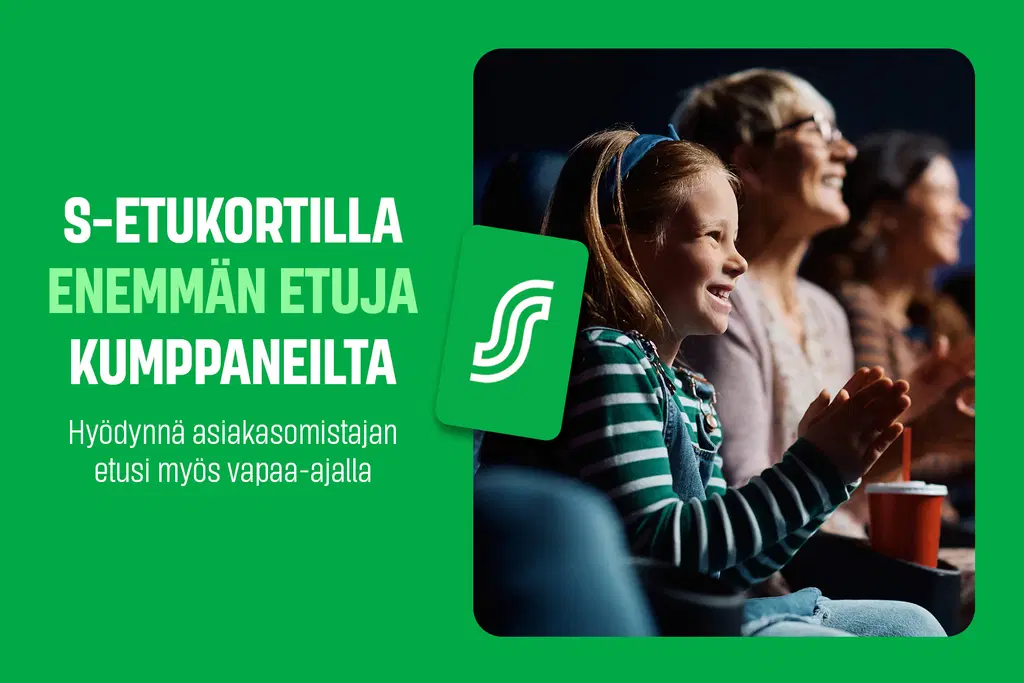 Olipa viikonlopun suunnitelmissa sitten teatteri-ilta, ottelutapahtuma, tanssiesitys, liikuntatapahtuma tai illallinen ravintolassa, S-Etukortilla saat etuja useiden kumppaneidemme palveluista ja lipuista. Asiakasomistajan etu tekee elämyksistä helpommin saavutettavia ja tuo lisäarvoa vapaa-aikaan.Kumppaneihimme kuuluu monipuolinen joukko toimijoita eri aloilta: löydät etuja mm. teatteriesityksiin, otteluihin ja liikuntaelämyksiin. S-Etukortilla hyödyt enemmän, missä sitten liikutkin.